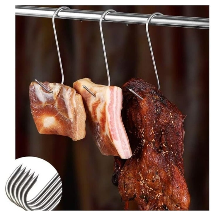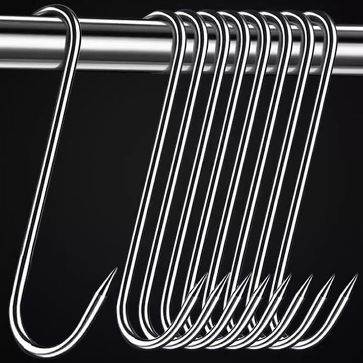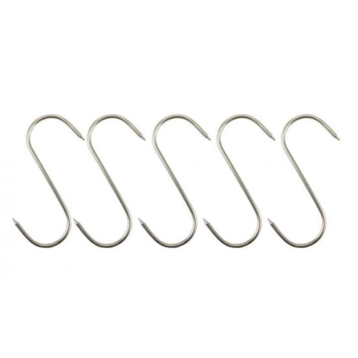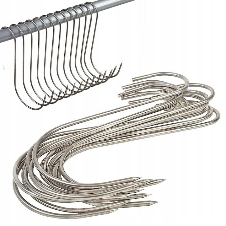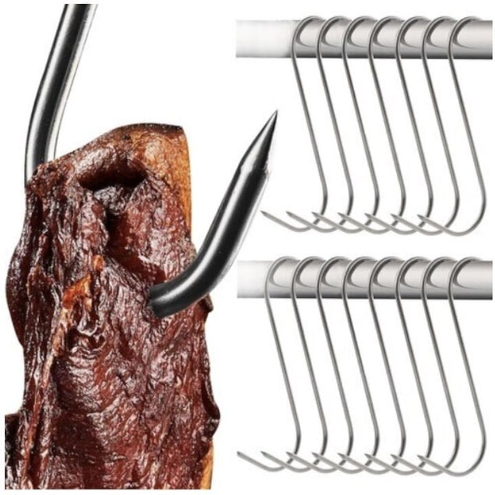 Forma tip S permite agățarea ușoară a cărnii pe suporturi, bețe de afumătoare, cârlige de depozitare sau frigidere profesionale. Suprafața netedă previne ruginirea și asigură igienă optimă, fiind ușor de curățat și reutilizat.